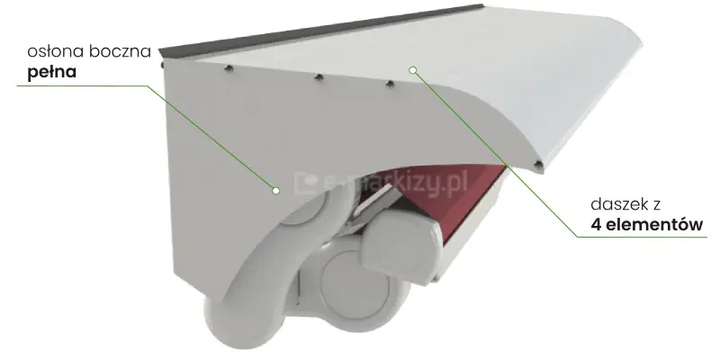 Do każdej markizy można zamontować dodatkową osłonę górną i boczną, która skutecznie zabezpiecza całą konstrukcję przed niekorzystnymi warunkami atmosferycznymi. Półkaseta chroni kluczowe elementy markizy, takie jak zwinięta tkanina oraz okolice silnika, co zwiększa ich trwałość i odporność na działanie czynników zewnętrznych. Dodatkowa ochrona przed deszczem znacząco wydłuża okres bezawaryjnego użytkowania markizy.
