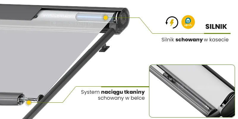 - Sterowanie: Dostępne są różne opcje sterowania systemem veranda, w tym sterowanie przyciskiem, zdalne sterowanie radiowe, czy też sterowanie przez aplikację mobilną. Wybór zależy od Twoich preferencji i możliwości integracji z istniejącym systemem inteligentnego domu. W zależności od preferowanego sposobu zarządzania ruchem rolety poziomej konieczny będzie dobór odpowiedniego silnika – z wbudowaną centralką, bądź bez takiej centralki.