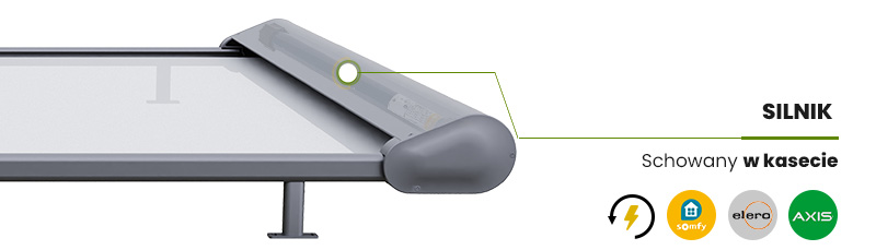 Veranda napęd elektryczny AXIS Standard do systemu veranda to najbardziej typowy i zarazem niezawodny napęd. Wyposażony jest on w mechaniczne ustawienie wyłączników krańcowych. Silnik rurowy został zaprojektowany do pracy ciągłej przez czas do 4 minut. Po ok. 4 minutach ciągłej pracy zabezpieczenie termiczne wyłączy silnik na około 20 min. Do obsługi tego silnika wymagany jest standardowy przełącznik roletowy lub automatyka (centralka + pilot). Silnik może być podłączony do dowolnej automatyki np. Yooda, Somfy.