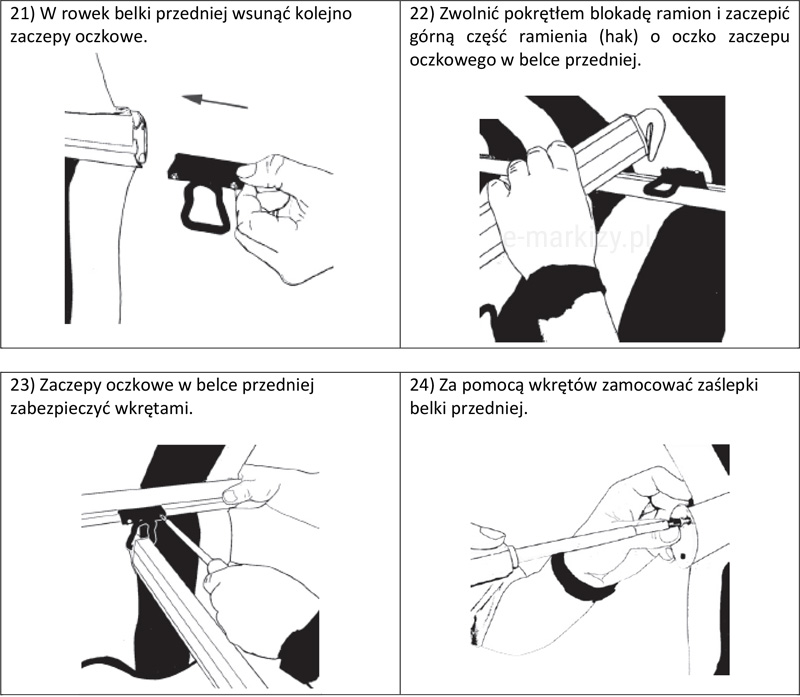 W rowek belki przedniej wsunąć kolejno zaczepy oczkowe. Zwolnić pokrętłem blokadę ramion i zaczepić górną część ramienia (hak) o oczko zaczepu oczkowego w belce przedniej. Zaczepy oczkowe w belce przedniej zabezpieczyć wkrętami. Za pomocą wkrętów zamocować zaślepki belki przedniej.