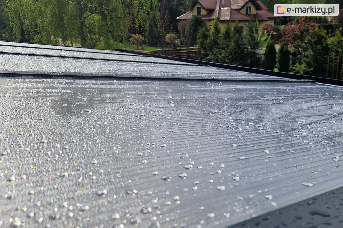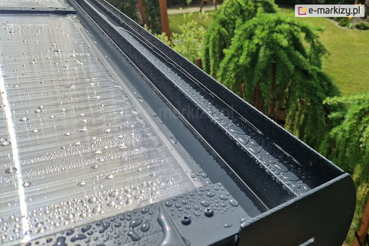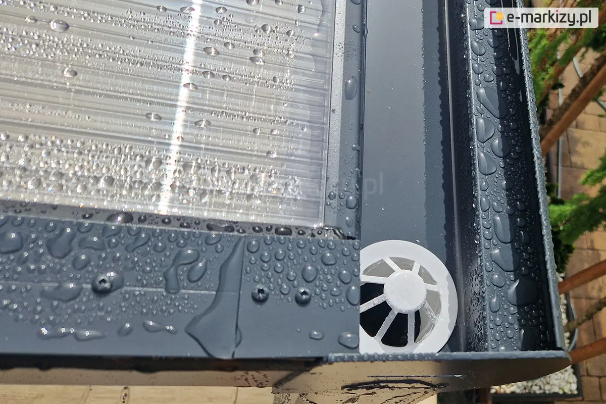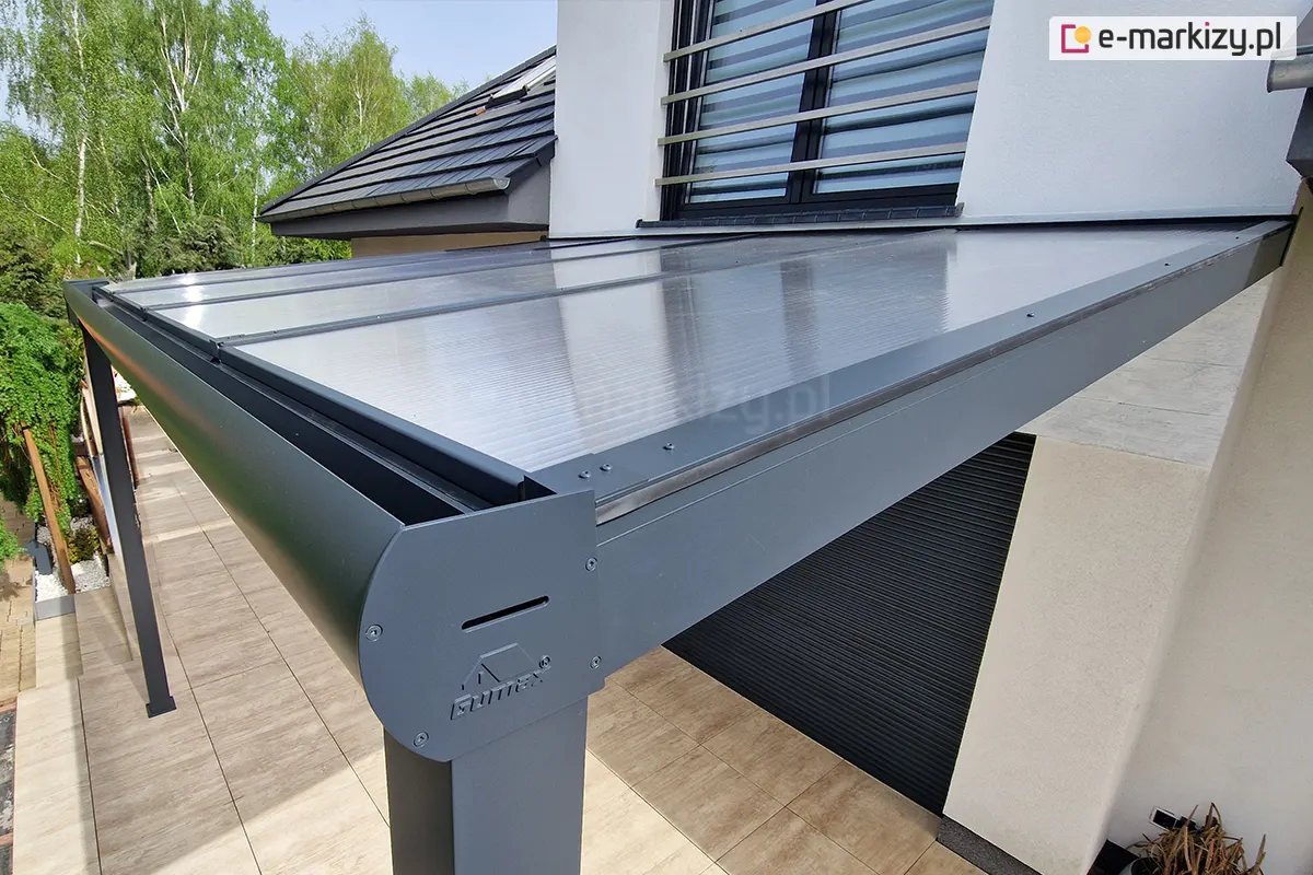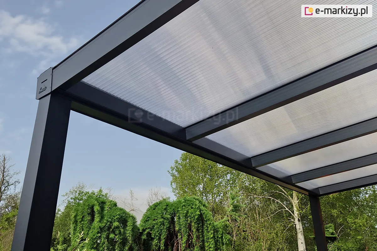 Zadaszenie tarasowe z poliwęglanu GUMAX składa się z aluminium, które zostało poddane specjalnej obróbce powierzchni. Tworzy to warstwę ochronną, która zapobiega dalszej korozji. Dach aluminiowego zadaszenia wykonany jest z nowoczesnego poliwęglanu, który charakteryzuje się wysoką odpornością na wpływy zewnętrzne. W zestawie znajduje się skuteczny filtr UV, który chroni przed szkodliwym promieniowaniem słonecznym. Konstrukcja standardowo wyposażona jest w przedni okapnik odprowadzający wodę.