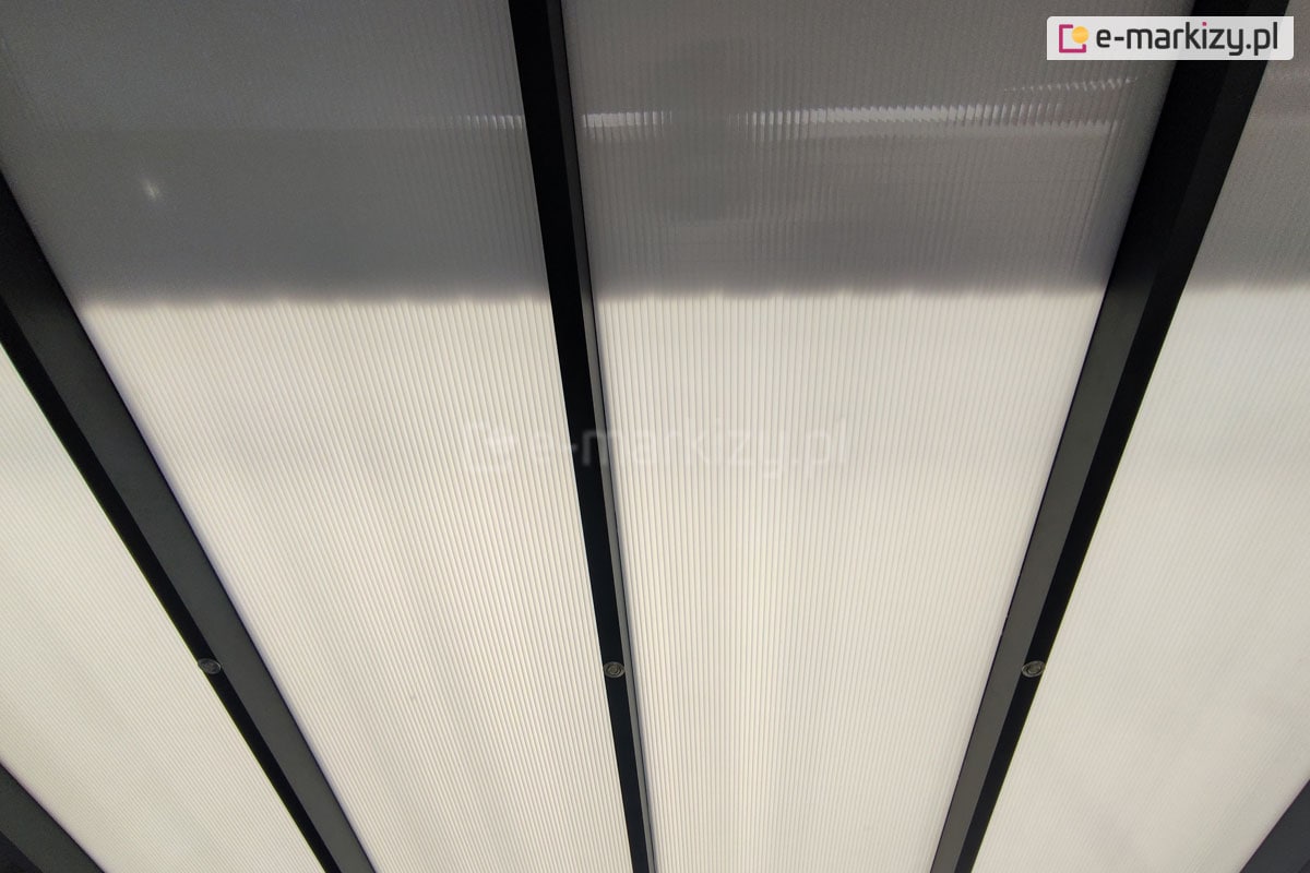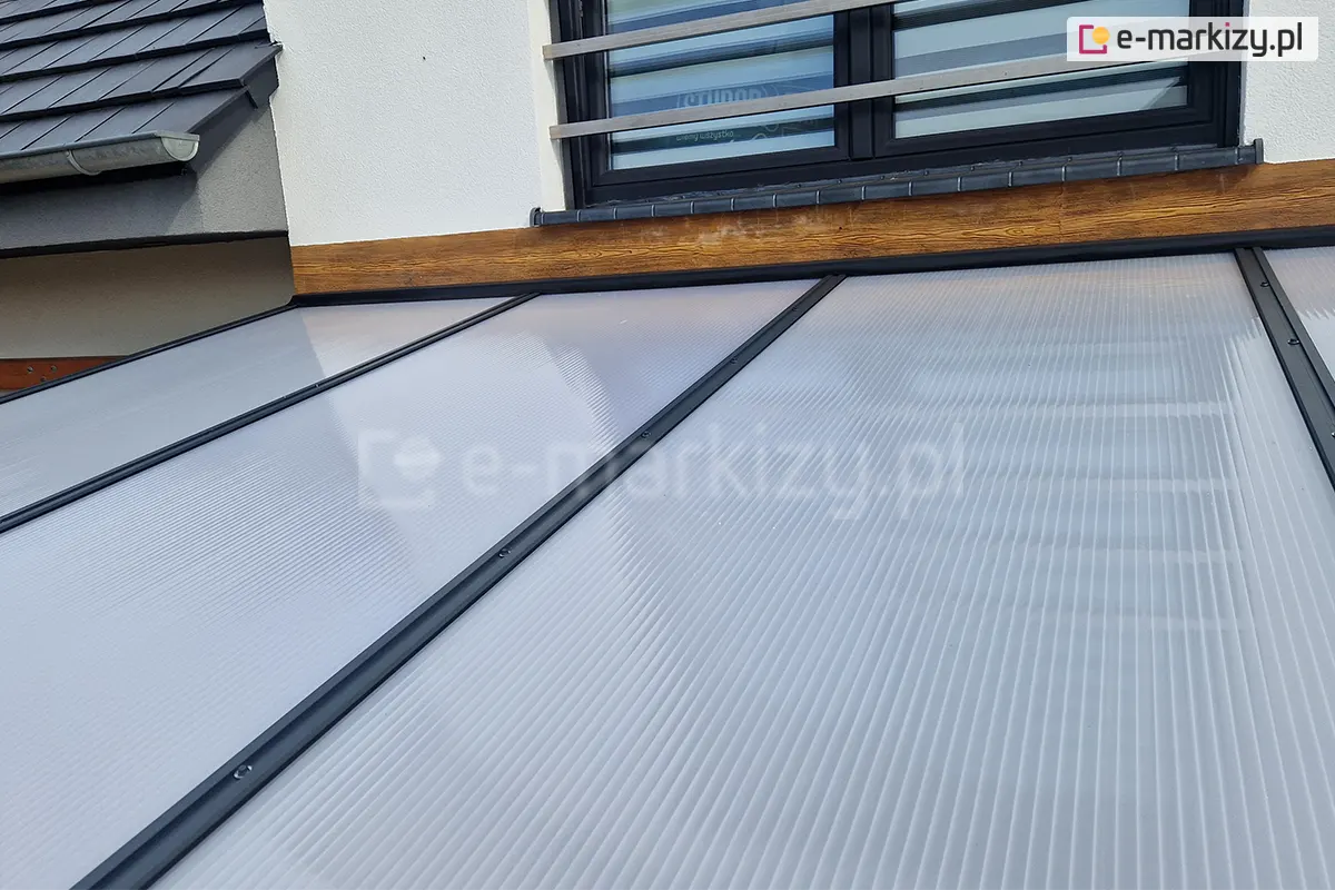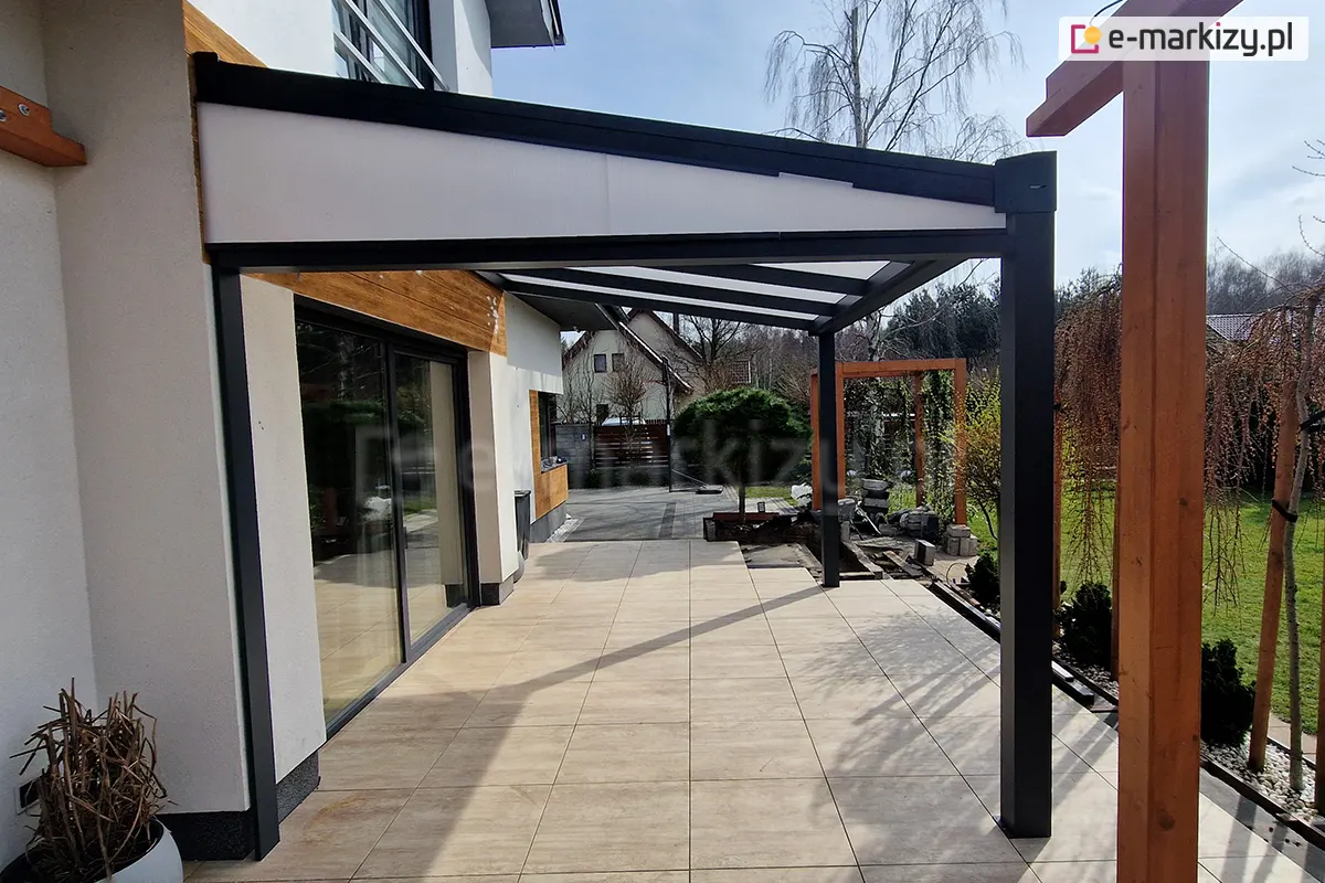 Standardowe kolory zadaszenia Modes to biały, antracyt i brąz. Najczęściej wybierane przez klientów to kolory biały i antracyt – co widać na zdjęciach w galerii/ Dach poliwęglanowy dostępny jest w trzech odcieniach: przezroczystym, dymionym i opal (mlecznym). W tym obszarze klienci wybierają różne rozwiązania, choć stosunkowo najrzadziej wybierany jest poliwęglan dymiony. Często wybierany jest natomiast poliwęglan lity, który jest doskonałą alternatywa dla szkła.