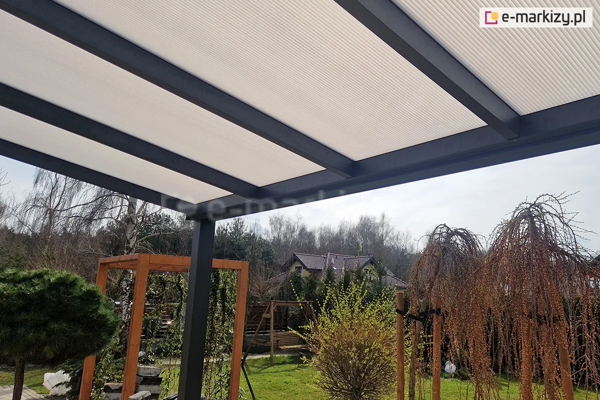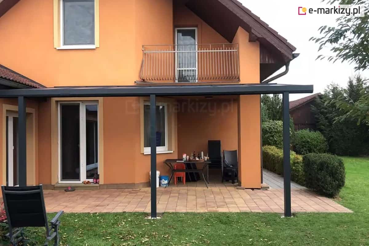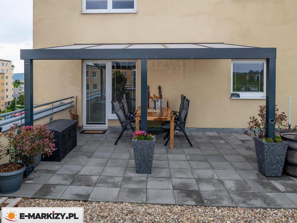 Zadaszenie tarasowe Modes z poliwęglanem to solidna konstrukcja wykonana z lekkiego aluminium, pokryta odporną na warunki atmosferyczne farbą proszkową. Dzięki wytrzymałości i trwałości konstrukcji, użytkownicy mogą cieszyć się tarasem przez długi czas, nie martwiąc się o konieczność konserwacji. Krycie dachu poliwęglanem o grubości 10 mm lub 16 mm, dostępnym w wersji komorowej lub litym, zapewnia nie tylko ochronę przed warunkami atmosferycznymi, ale także estetyczny wygląd zadaszenia. Zadaszenie tarasowe Modes galeria zdjęć prezentuje nowoczesne wiaty tarasowe, propozycje aranżacji tarasu z wykorzystaniem zadaszenia Modes.