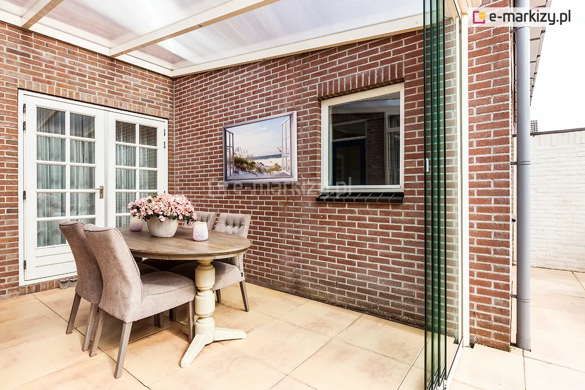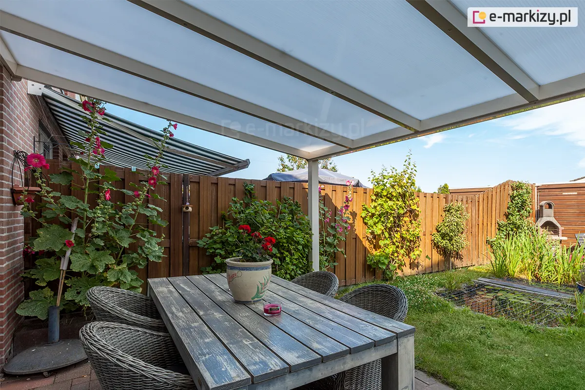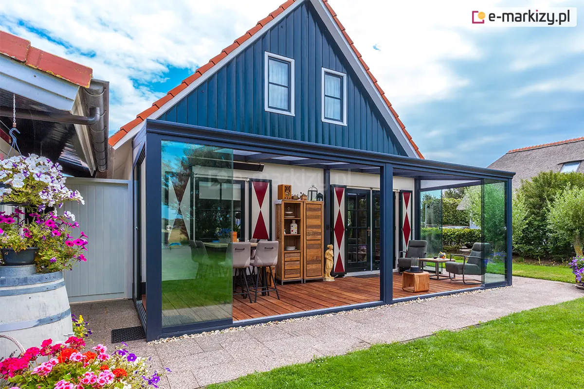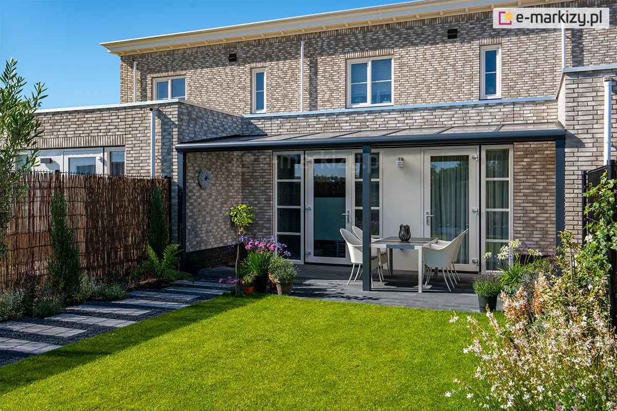 Decydując się na zadaszenie tarasowe warto rozważyć także możliwość częściowego przesłonięcia ścian bocznych. W ofercie znajdziesz kliny wykonane z poliwęglanu lub szkła, które przesłaniają przestrzeń pomiędzy skosem dachu a ścianą boczną (do wysokości podpory przedniej).