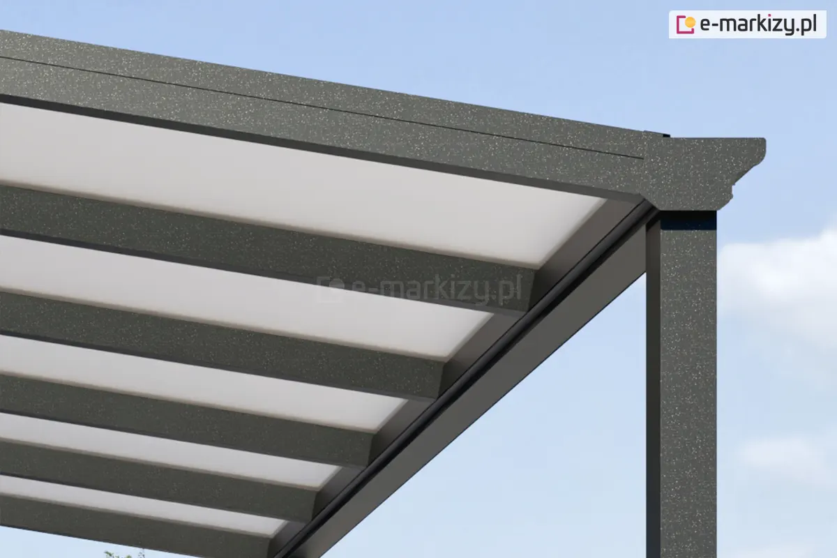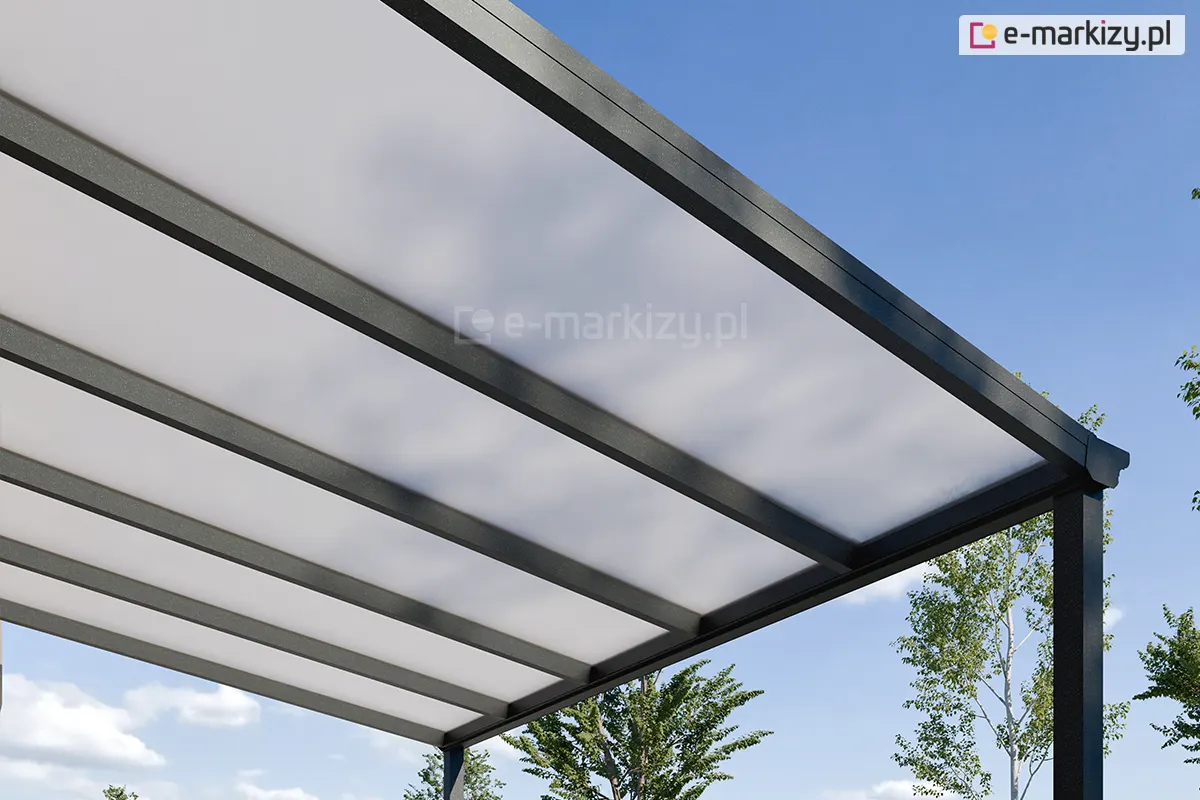 Poliwęglan zadaszenie Lunaro wykonany jest z nowoczesnego poliwęglanu komorowego o grubości 16mm, który charakteryzuje się wysoką odpornością na wpływy zewnętrzne oraz naturalną zdolnością do odpychania brudu, mchów i pleśni. Dostępny jest w czterech opcjach kolorystycznych o różnych właściwościach przeciwsłonecznych. Poliwęglan na dach modelu Lunaro wyposażony jest także w skuteczny filtr UV, chroniący przed szkodliwym promieniowaniem. Dzięki temu możesz cieszyć się spędzaniem czasu na tarasie bez ograniczeń.