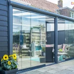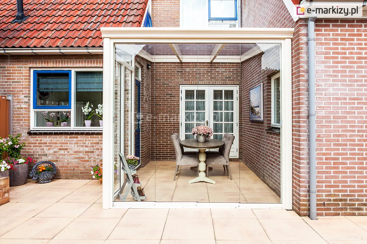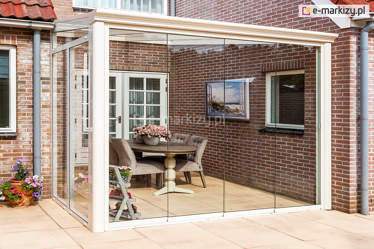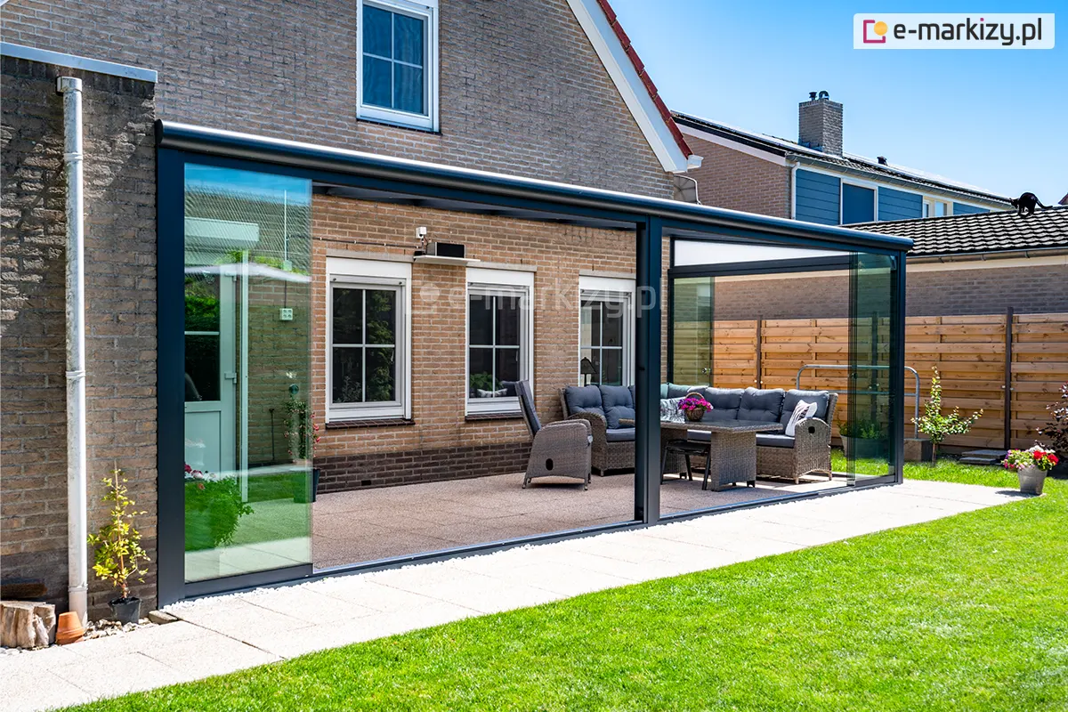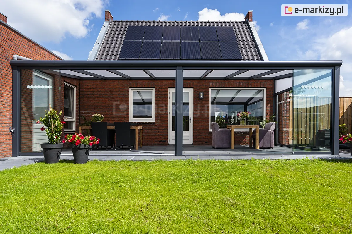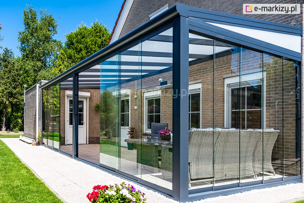 • ściany frontowe, wykonywane są ze szkła bezpiecznego, w systemie 2 do 6 szyn, co zapewnia możliwość całkowitego lub częściowego przesłonięcia przestrzeni pod zadaszeniem z poliwęglanu,