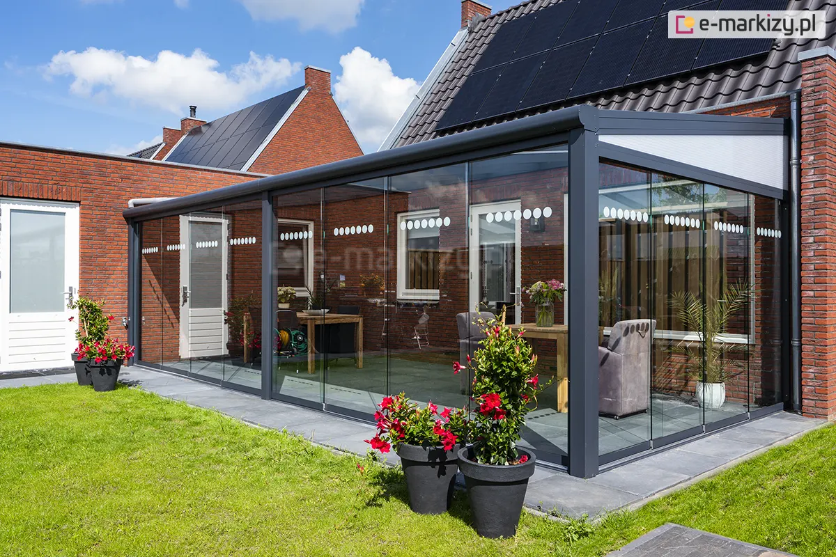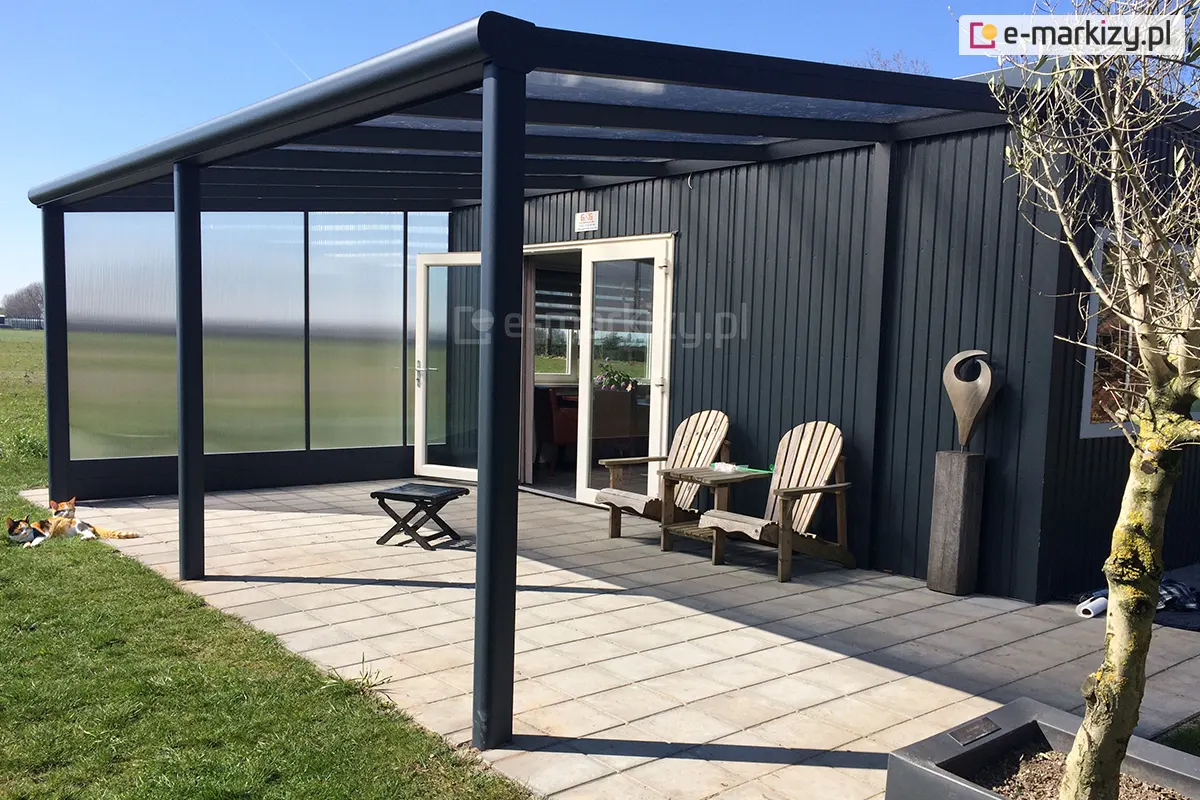 • ściany boczne, wykonywane są z poliwęglanu komorowego, w kilku możliwościach aranżacji – pełnej zasłony, przesłony z wykorzystaniem trójkąta (klinu pomiędzy ścianą a profilem dachu) z poliwęglanu lub szkła.