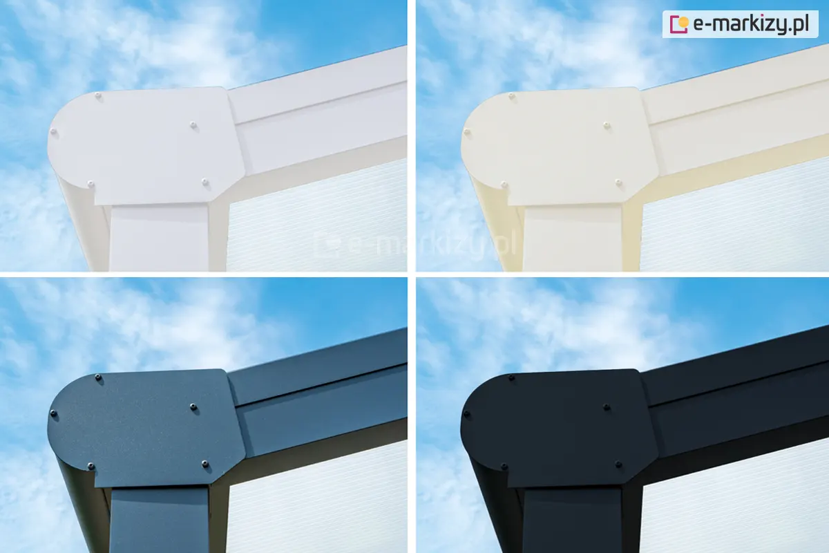 Konstrukcja standardowo wyposażona jest w przednią rynnę w dwóch kształtach do wyboru odprowadzającą wodę do przednich podpór, co zapewnia doskonałą ochronę przed deszczem. Model zadaszenia Lunaro jest dostępne z profilami aluminiowymi malowanymi proszkowo na kolor biały lub kremowo-biały, a także antracytowy i czarny.