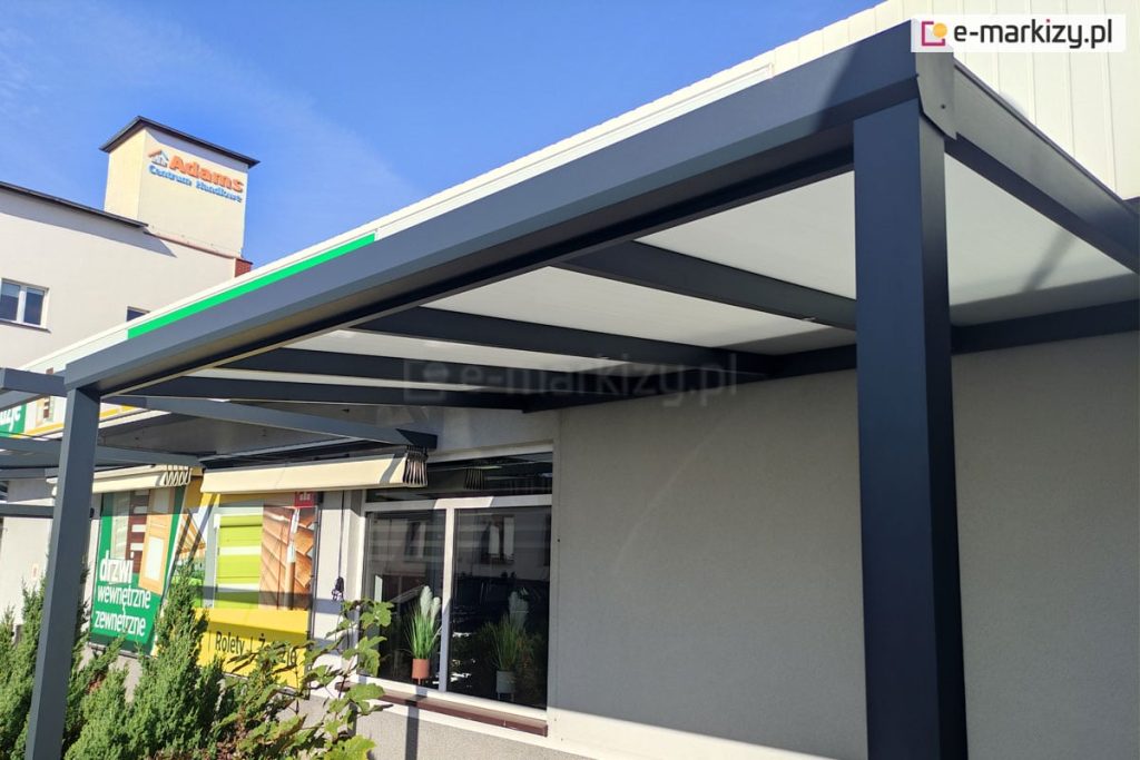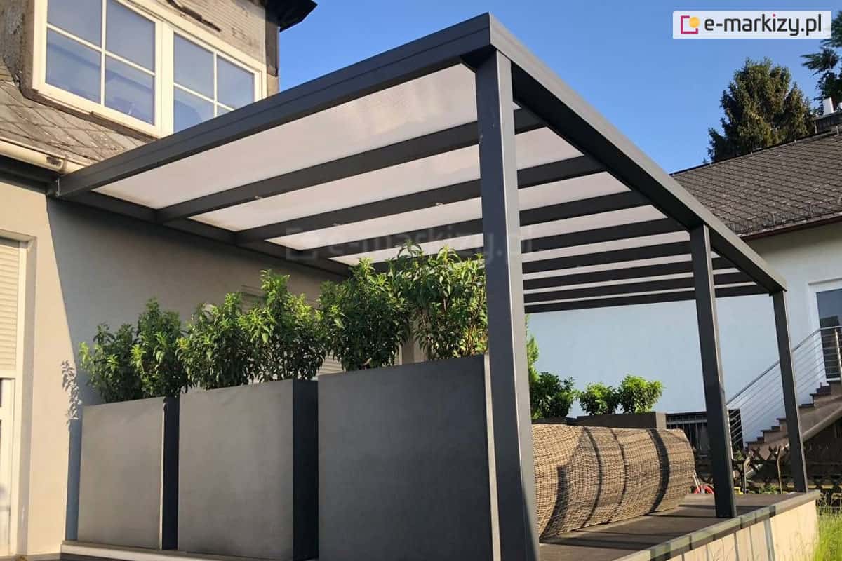 Konstrukcje zadaszeń tarasowych wykonywane są w trzech standardowych kolorach: biały, antracyt i brąz. Dla poszukujących innych barw elementów aluminiowych wprowadziliśmy możliwość wyboru innych kolorów przy dłuższym oczekiwaniu lub za dopłatą. Dach poliwęglanowy dostępny jest w trzech odcieniach: przezroczystym, dymionym i opal (mlecznym). Dodatkowe opcje obejmują roletę rzymską, zabudowę boczną roletami zip screen lub szkłem przesuwnym, a także trójkątną boczną ściankę z poliwęglanu. Dzięki temu masz dostępny bardzo szeroki zakres personalizacji, zarówno jeśli chodzi o kolorystykę, jak i dodatkowe funkcje zadaszenia.