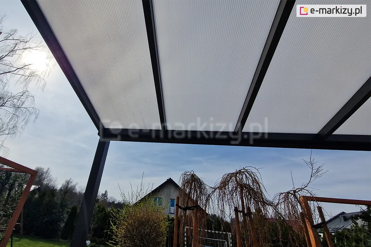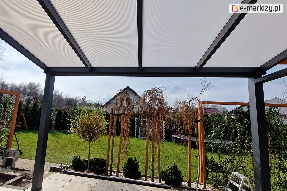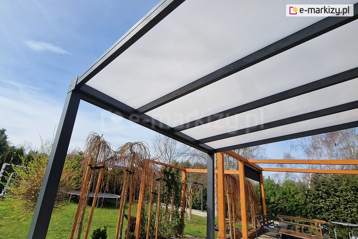 Zadaszenie tarasowe Modes to nowoczesne i trwałe rozwiązanie idealne do ochrony przed różnymi warunkami atmosferycznymi. Całoroczne zadaszenie tarasu z poliwęglanem to trwała konstrukcja wykonana z aluminium, pokryta farbą proszkową, co zapewnia ochronę przed warunkami atmosferycznymi. Dzięki lekkości w porównaniu do stali, brakowi konieczności konserwacji oraz trwałości, umożliwia korzystanie z tarasu przez wiele lat. Do zadaszenia konstrukcji wykorzystywane są płyty poliwęglanowe 10mm i 16mm (do wyboru), wykonane z poliwęglanu komorowego lub poliwęglanu litego. Zastosowany poliwęglan posiada atesty potwierdzające jego wytrzymałość pod obciążeniem śniegiem oraz ochronę przed promieniowaniem UV. W ofercie dostępny jest również poliwęglan opal (mleczny), chroniący przed nadmiernym nagrzewaniem się wnętrza w upalne dni. Dzięki swoim właściwościom, poliwęglan jest lekki, wytrzymały, przepuszczający światło i niezniszczalny, idealny do zadaszenia różnorodnych powierzchni.