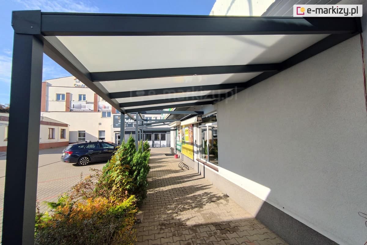 Konstrukcja zadaszenia Modes wykonana jest z aluminium malowanego proszkowo. Warto zwrócić uwagę, że zadaszenie montowane jest do ściany i do jego prawidłowego działania zalecany jest kąt pochylenia płaszczyzny dachu 8°. Standardowa wysokość podpór to 230 cm, a dokładne wymiary wszystkich elementów konstrukcji znajdziesz w zakładce z danymi technicznymi.