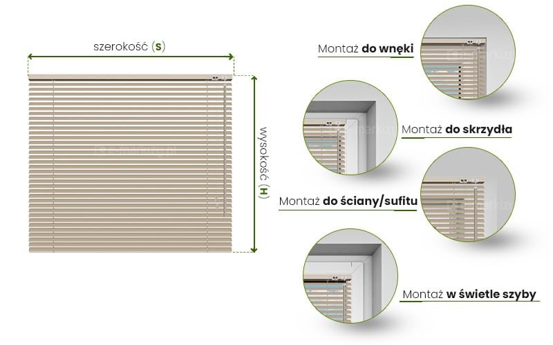 Żaluzja jest mocowana na uchwytach dopasowanych do miejsca montażu. Uchwyty te dobierane są automatycznie do wybranego sposobu mocowania. Więcej informacji o samych mocowaniach znajdziesz na stronie z danymi technicznymi żaluzji.