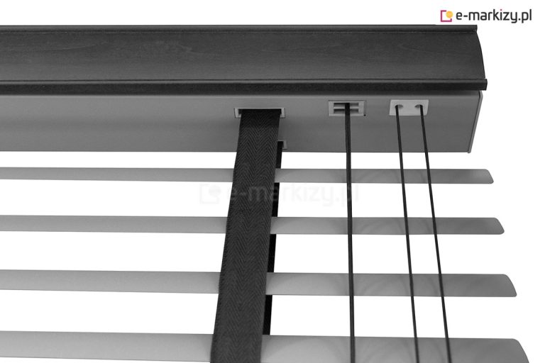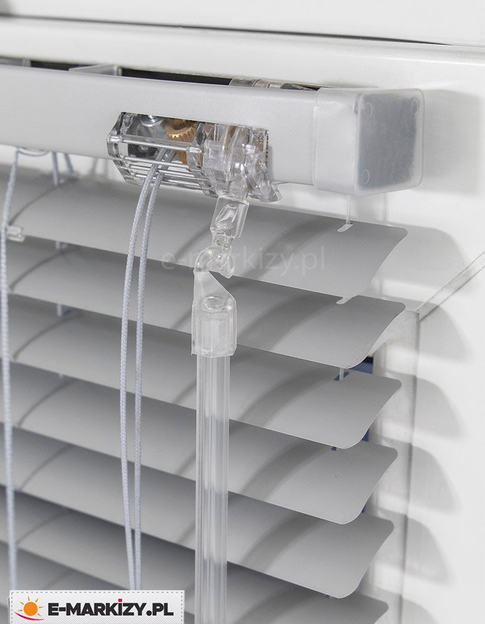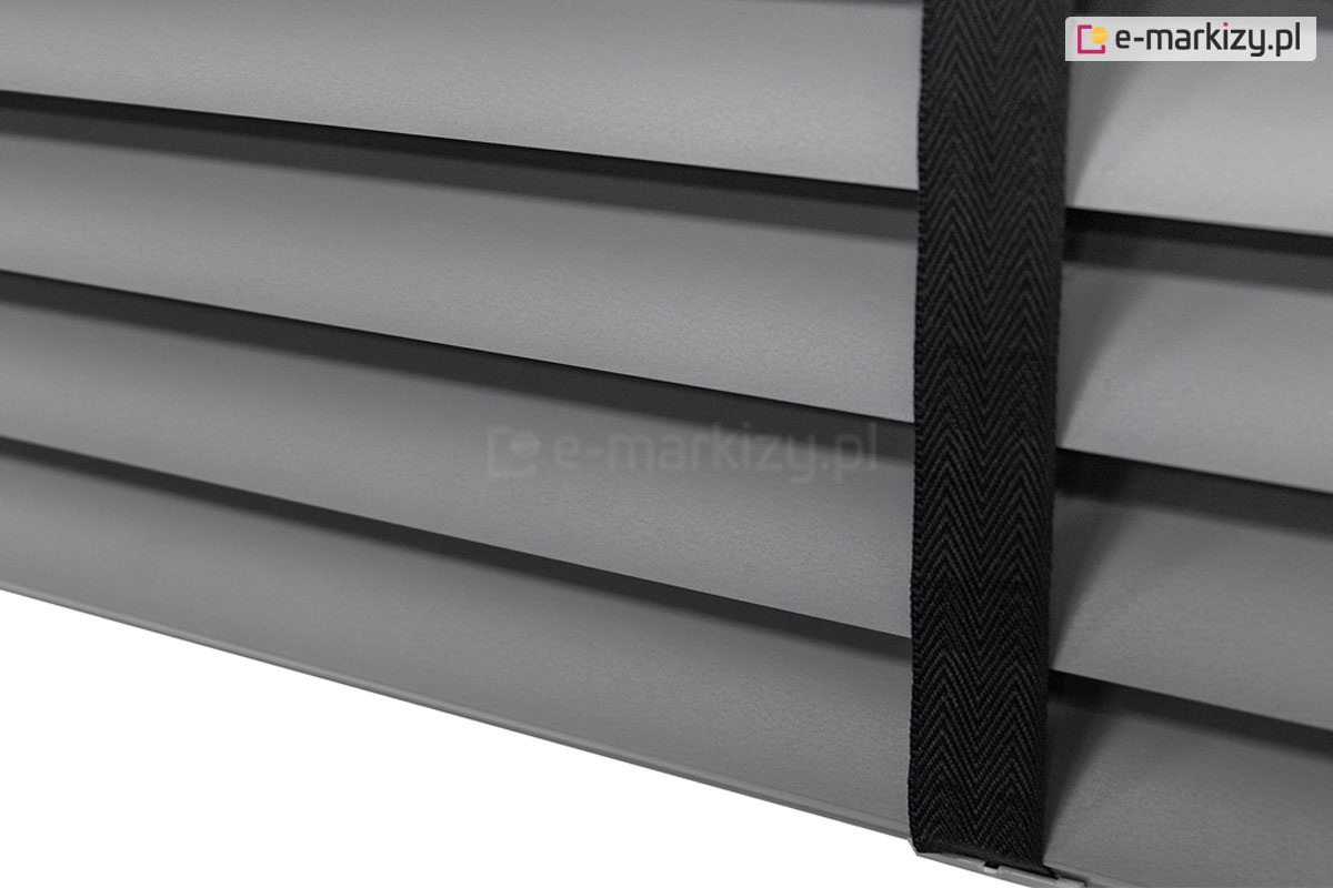 Wśród elementów składających się na żaluzję aluminiową 50 mm warto wymienić drabinkę. W standardowym wykończeniu stosowana jest drabinka sznurkowa w kolorze dopasowanym do kolorystyki lamel. Jako opcja dodatkowa możesz wybrać żaluzję wyposażoną w drabinkę taśmową. Taśma ma szerokość 2,5 cm i jest dostępna w kilku kolorach do wyboru. Co istotne, w przypadku zastosowania drabinki taśmowej, w tym samym kolorze wykonane zostaną sznurki do sterowania żaluzją.