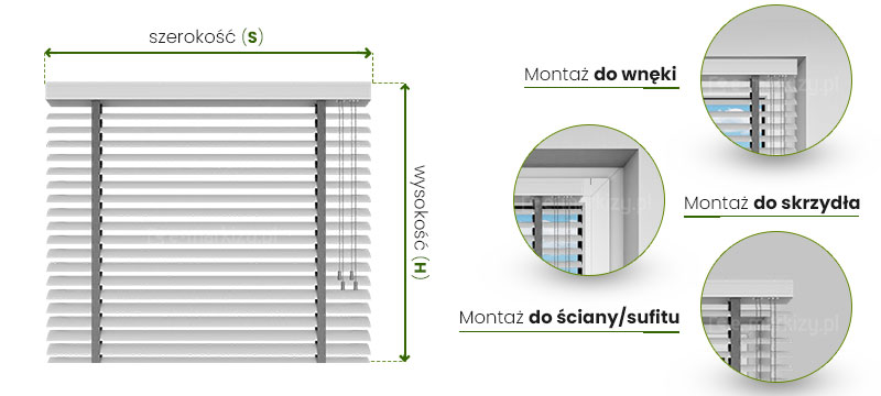 W naszej ofercie znajdziesz przede wszystkim żaluzje na wymiar. Żaluzje z lamelami 50 mm można wykonać w maksymalnej szerokości do 360cm. Maksymalna wysokość na jaką można wykonać wewnętrzne żaluzje aluminiowe 50mm to 400cm. Do zamówienia lub wyceny podajemy zawsze całkowity zewnętrzny wymiar osłony, łącznie z kasetą. W zależności od miejsca mocowania żaluzja pozioma 50mm powinna być nieco inaczej zwymiarowana. Aby ułatwić Ci dobór prawidłowego wymiaru Twojej osłony przygotowaliśmy szczegółowe wskazówki pomiarowe.