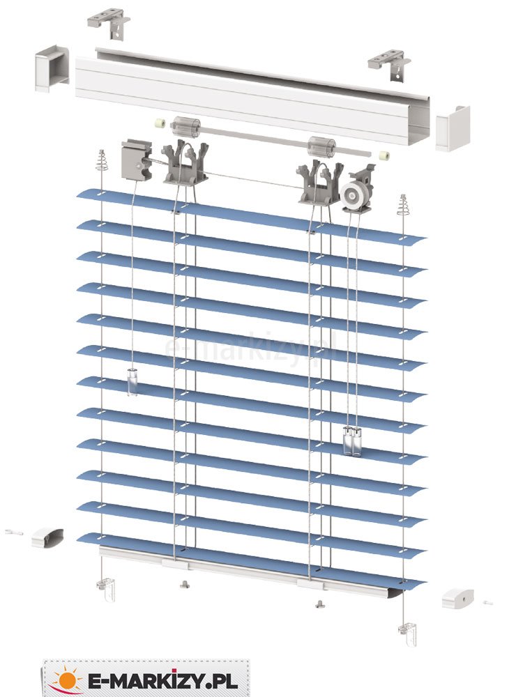 Żaluzja aluminiowa- 50mm komponenty, Rynny górna stalowa, Rynna dolna, Lamele aluminiowe, twist metalowy, mechanizm z przekładnią PCV, system hamujący