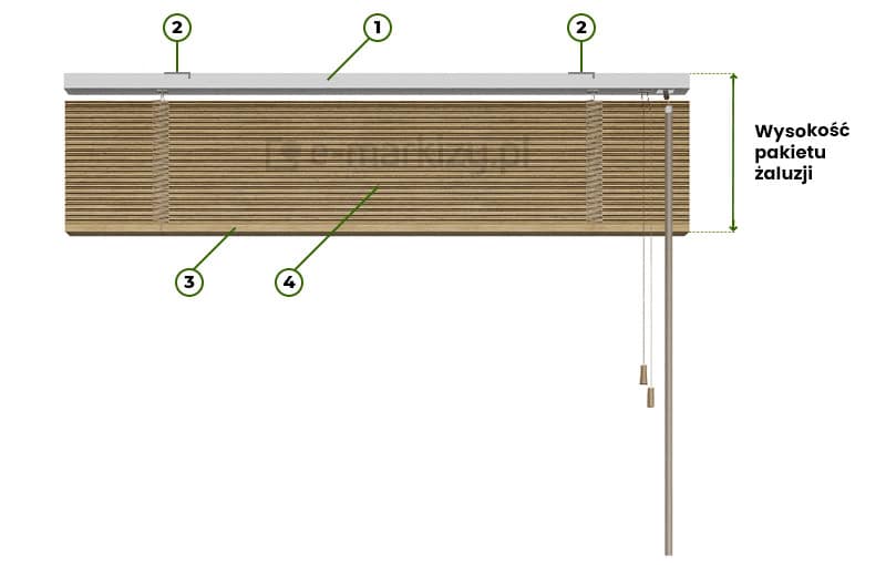 *Wysokość żaluzji uzależniona jest od skoku drabinki, czyli odległości pomiędzy szczebelkami drabinki. Standardowy skok drabinki w żaluzji drewnianej 25mm wynosi 2,15 cm. Czyli wysokość żaluzji to wielokrotność skoku 2,15 cm plus wysokość rynny górnej 2,5 cm oraz wysokość belki dolnej wraz z mocowaniem drabinki 2 cm.