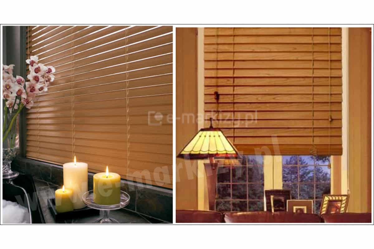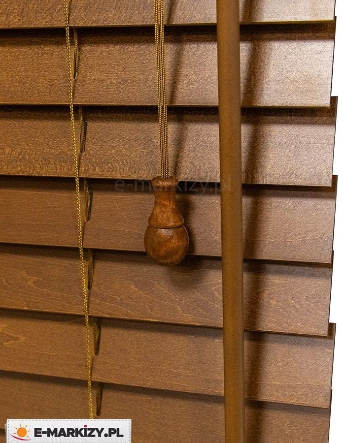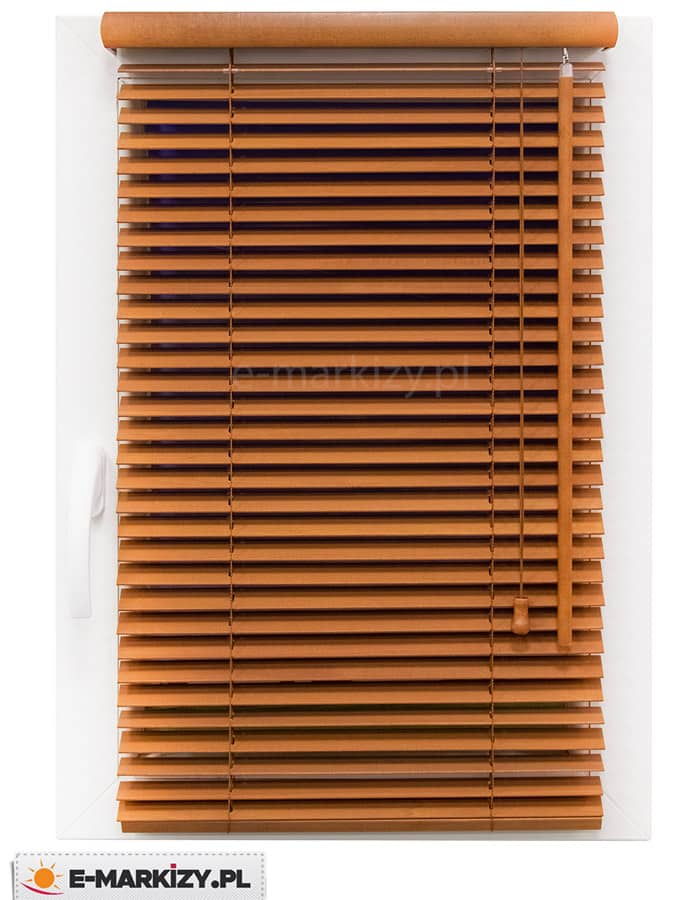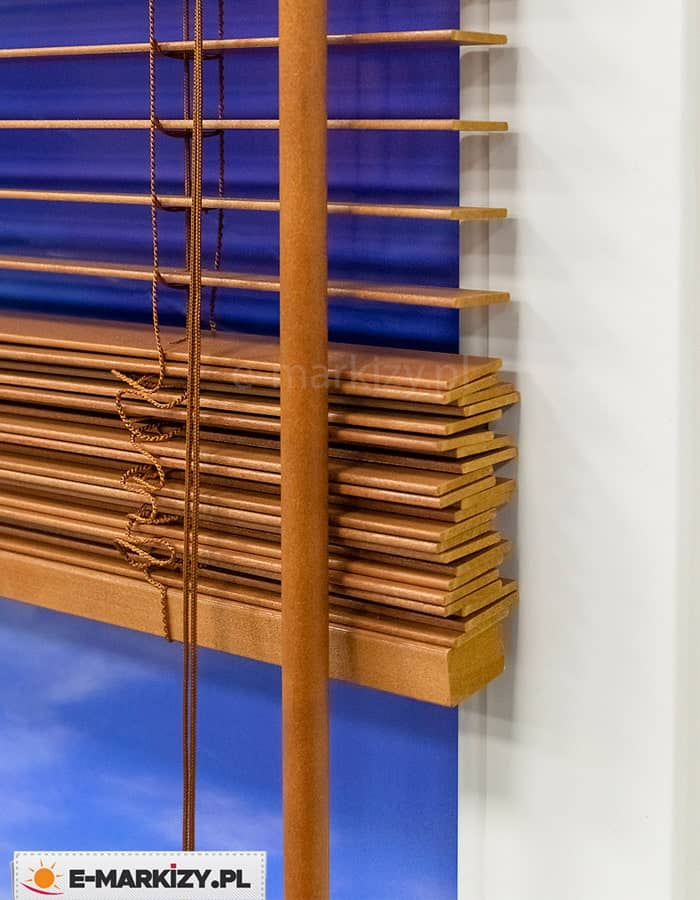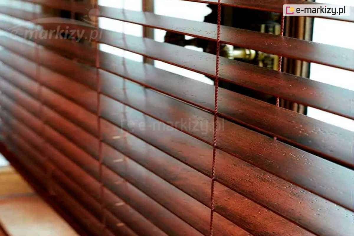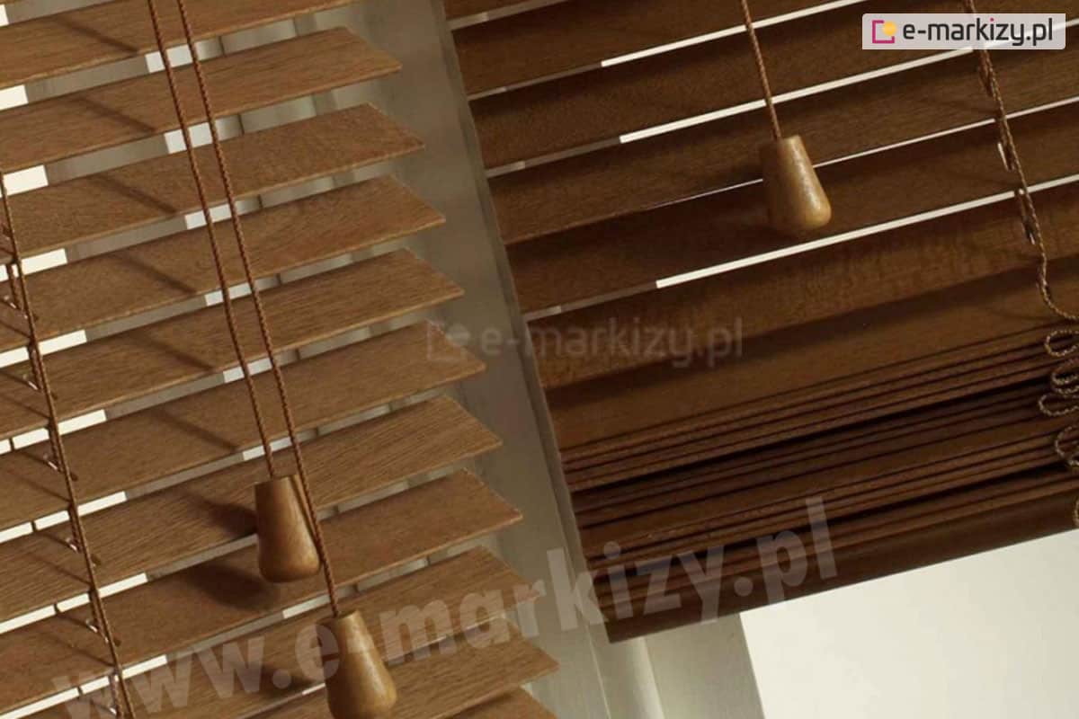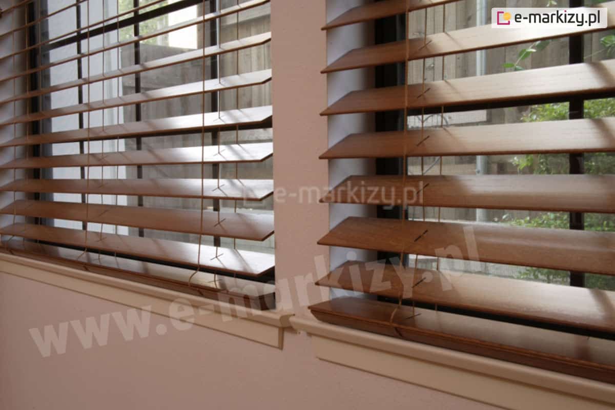 Prezentujemy bogatą galerię zdjęć żaluzji drewnianych wykonywanych na wymiar. Konstrukcja takiej żaluzji to m.in. rynna aluminiowa, która przykryta jest maskownicą drewnianą w kolorze lameli. Dolna rynna, maskownica górna i pokrętło drewniane są wykonane oczywiście z drewna i występują bez żadnej dopłaty w standardzie. Rolety drewniane te są wykonane z wysokogatunkowego drewna brzozowego. Najwyższej jakości pióra brzozowe w połączeniu z wytrzymałymi drabinkami sznurkowymi sprawiają, że żaluzje drewniane to estetyczne i wytrzymałe rozwiązanie osłonowe na wiele lat. Dostępne wielkości lameli żaluzji to 25mm oraz 50mm.