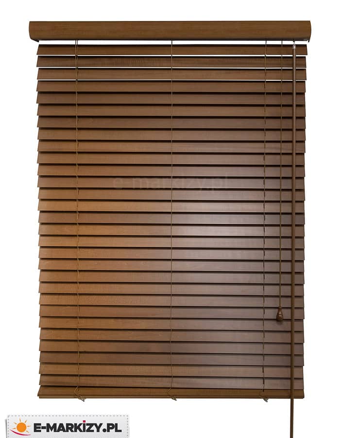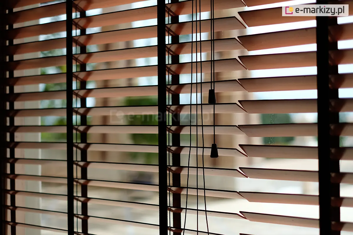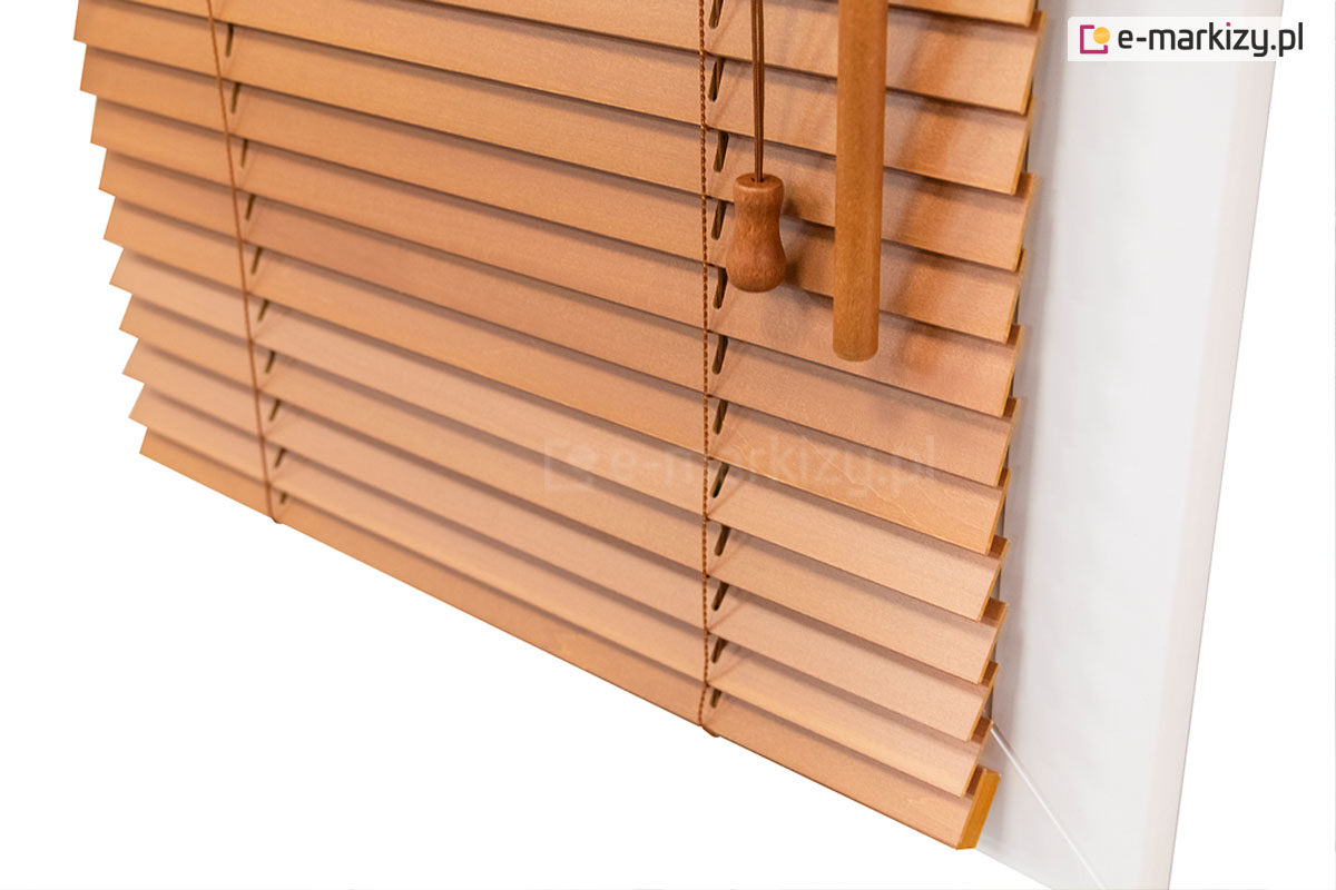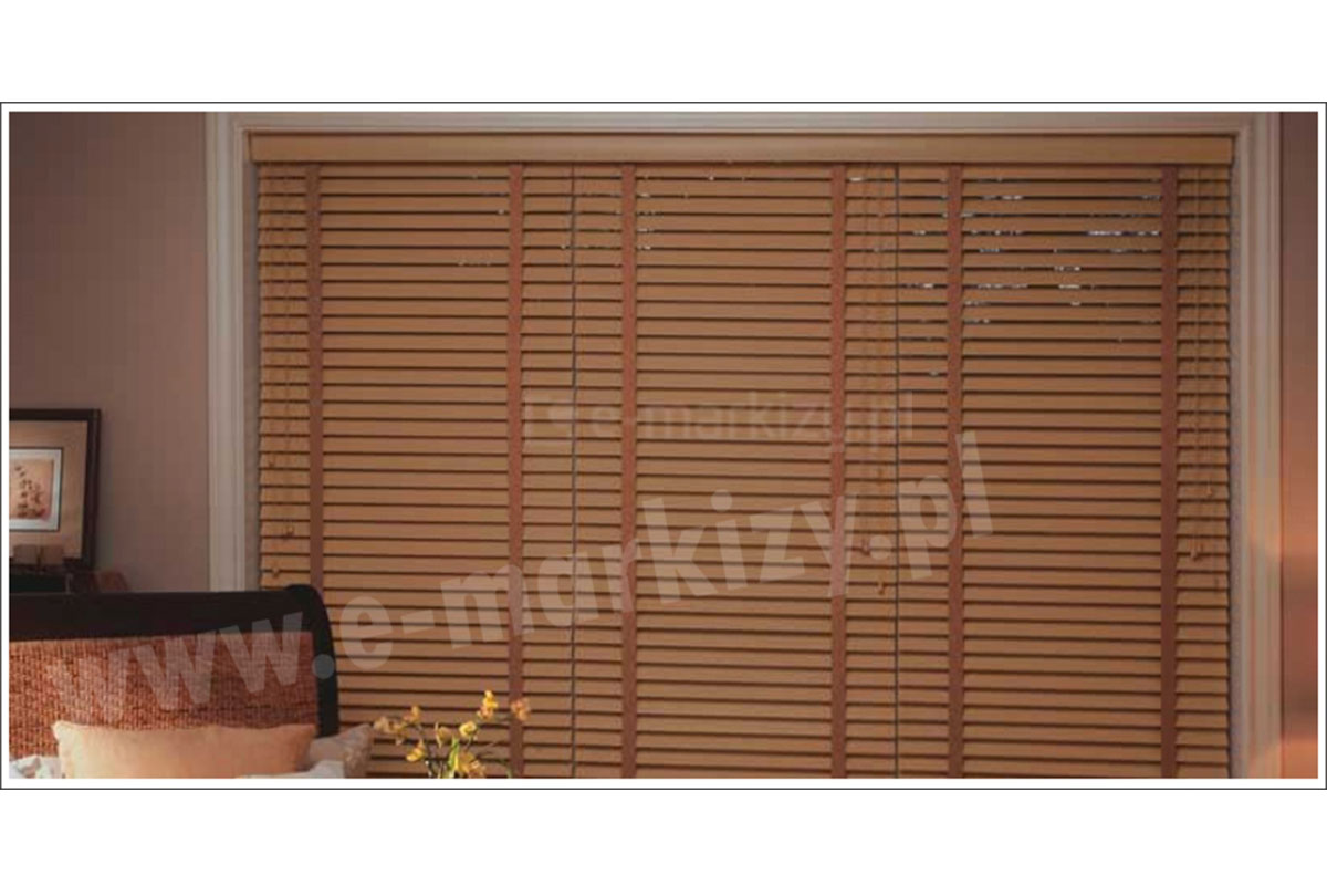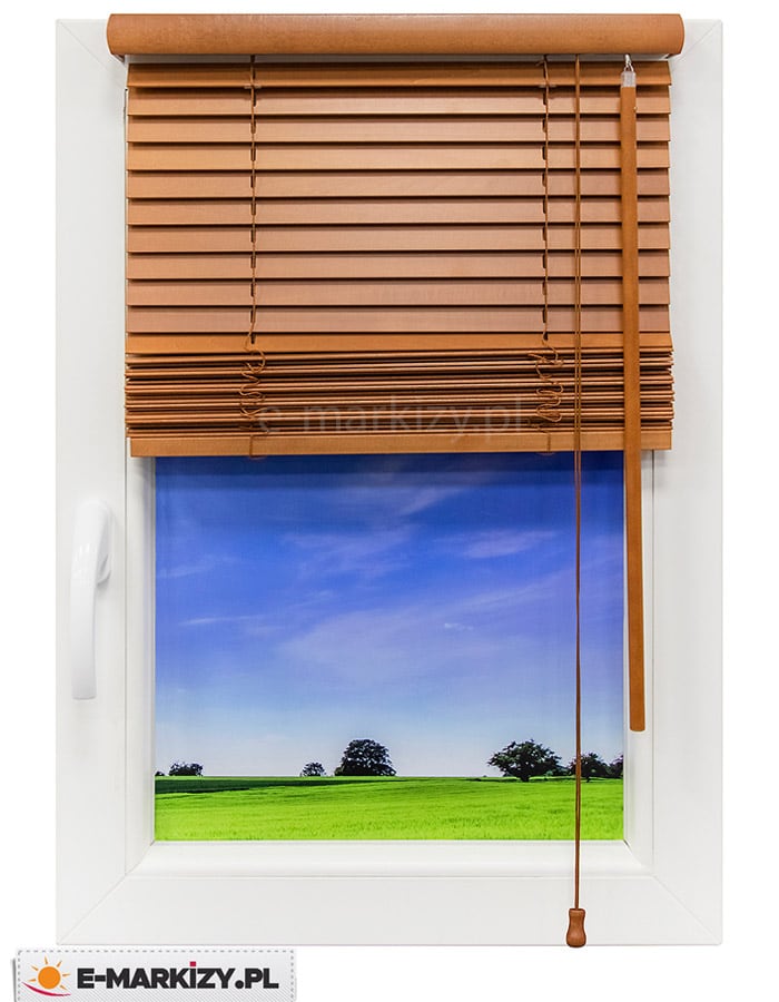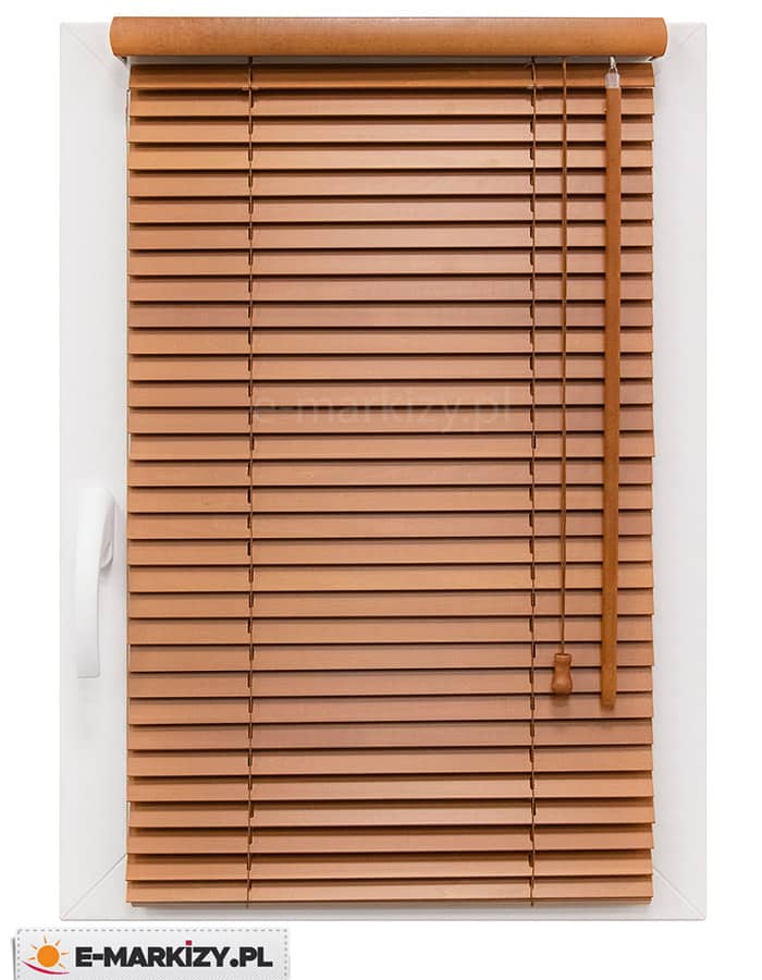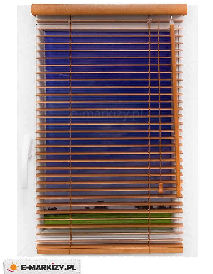 Prezentujemy bogatą galerię zdjęć żaluzji drewnianych wykonywanych na wymiar. Konstrukcja takiej żaluzji to m.in. rynna aluminiowa, która przykryta jest maskownicą drewnianą w kolorze lameli. Dolna rynna, maskownica górna i pokrętło drewniane są wykonane oczywiście z drewna i występują bez żadnej dopłaty w standardzie. Rolety drewniane te są wykonane z wysokogatunkowego drewna brzozowego. Najwyższej jakości pióra brzozowe w połączeniu z wytrzymałymi drabinkami sznurkowymi sprawiają, że żaluzje drewniane to estetyczne i wytrzymałe rozwiązanie osłonowe na wiele lat. Dostępne wielkości lameli żaluzji to 25mm oraz 50mm.