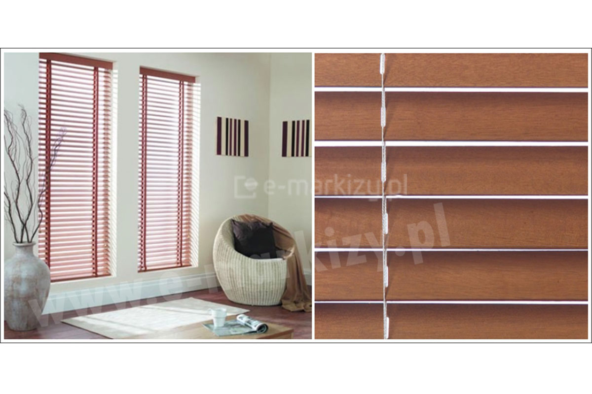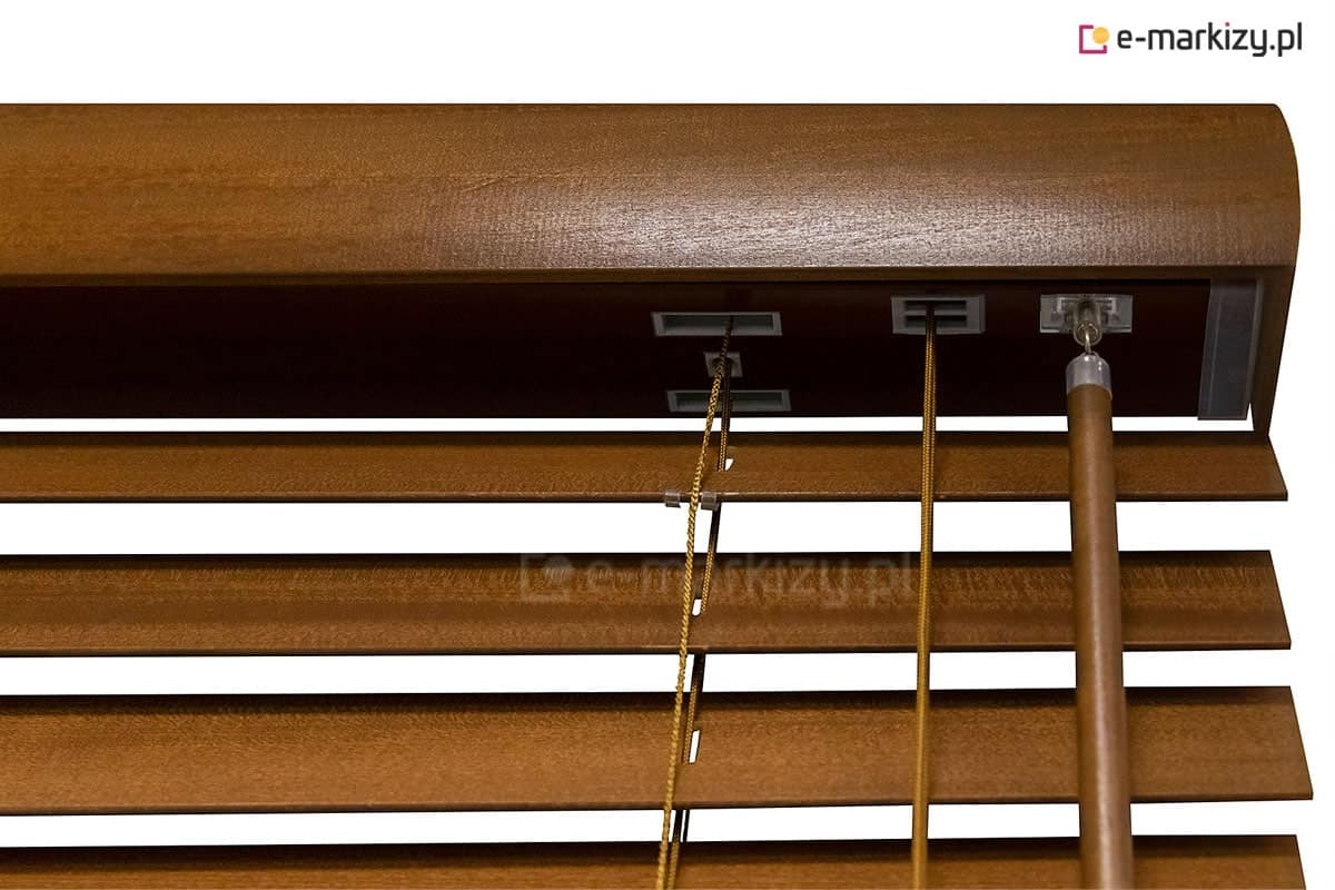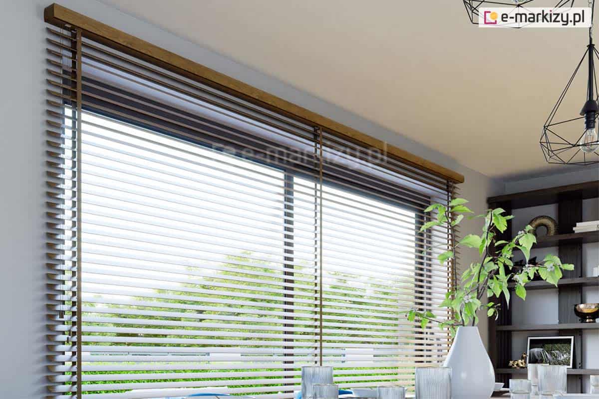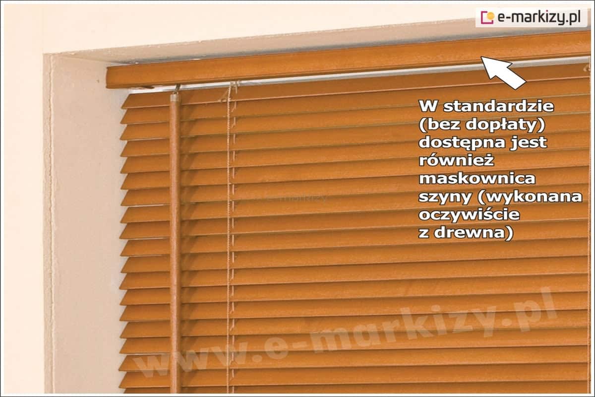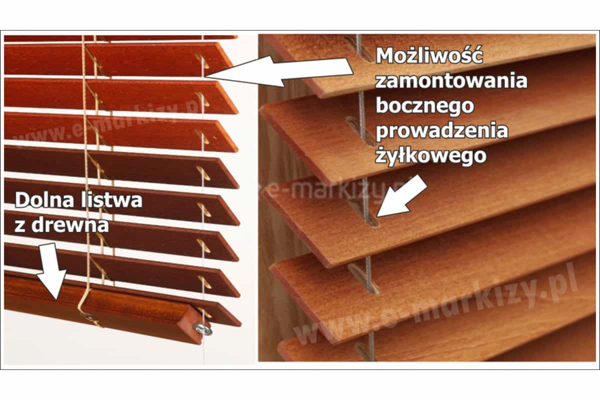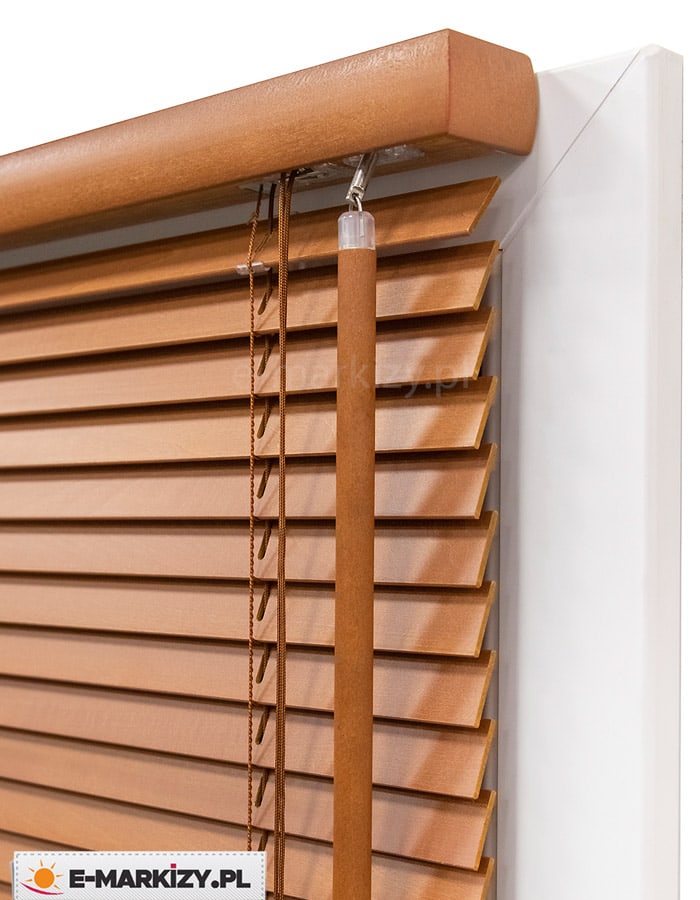 Prezentujemy bogatą galerię zdjęć żaluzji drewnianych wykonywanych na wymiar. Konstrukcja takiej żaluzji to m.in. rynna aluminiowa, która przykryta jest maskownicą drewnianą w kolorze lameli. Dolna rynna, maskownica górna i pokrętło drewniane są wykonane oczywiście z drewna i występują bez żadnej dopłaty w standardzie. Rolety drewniane te są wykonane z wysokogatunkowego drewna brzozowego. Najwyższej jakości pióra brzozowe w połączeniu z wytrzymałymi drabinkami sznurkowymi sprawiają, że żaluzje drewniane to estetyczne i wytrzymałe rozwiązanie osłonowe na wiele lat. Dostępne wielkości lameli żaluzji to 25mm oraz 50mm.