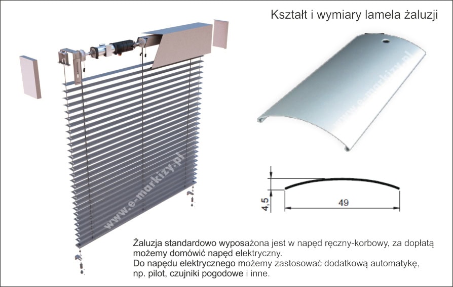 - Standardowo żaluzja wyposażona jest w napęd ręczny, sterowany za pomocą systemu sznurkowego – obrót lamel oraz zwijanie/rozwijanie żaluzji (bez dopłaty)