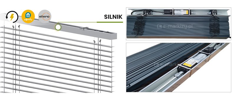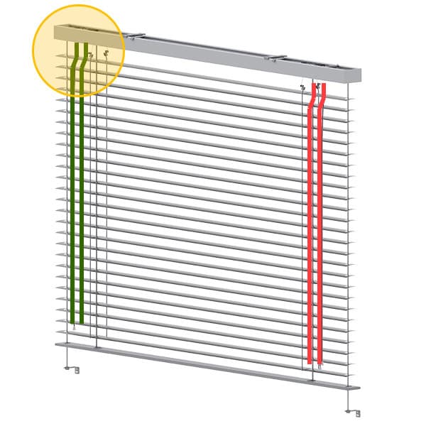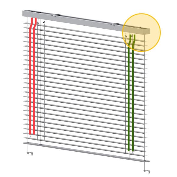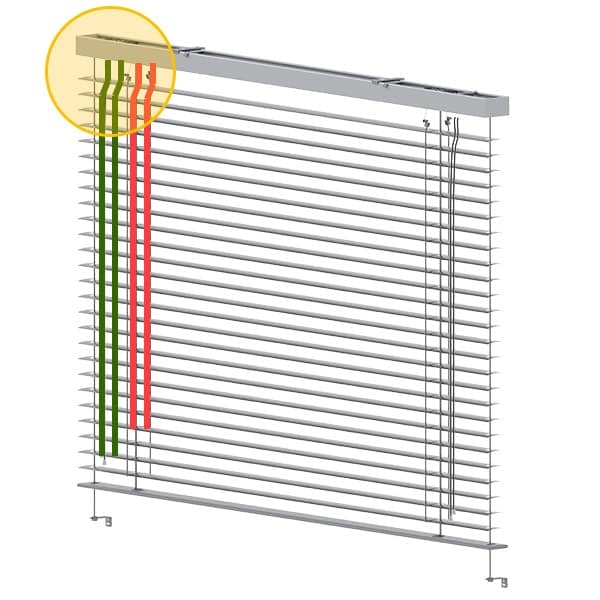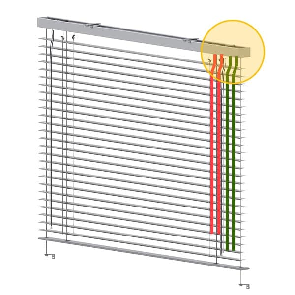 W przypadku napędu elektrycznego, przewód wyprowadzony jest na długość ok. 2mb i umiejscowiony mniej więcej na środku systemu. Można go podłączyć dowolnie z prawej lub z lewej strony żaluzji.