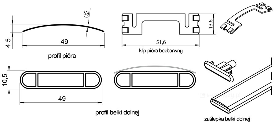 – Płaskie pióra w kształcie litery C o grubości 0.21 mm