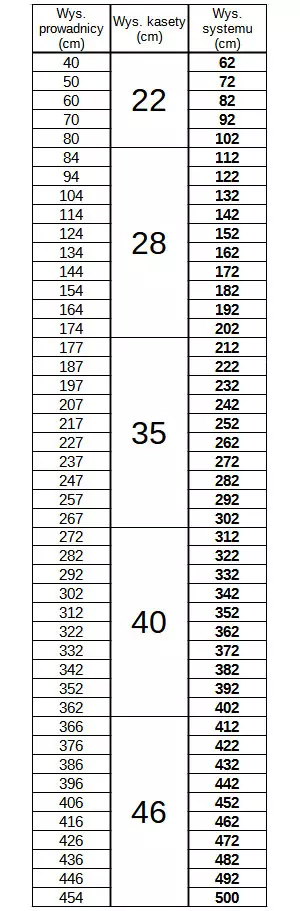 Wysokość kasety: 220, 280, 350, 400, 460 mm