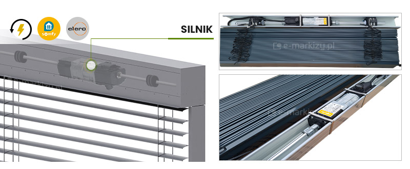 Żaluzja fasadowa Box może być sterowana silnikiem elektrycznym. przypadku napędu elektrycznego, przewód wyprowadzony jest na długość ok. 2mb i umiejscowiony mniej więcej na środku systemu. Można go podłączyć dowolnie z prawej lub z lewej strony żaluzji.
