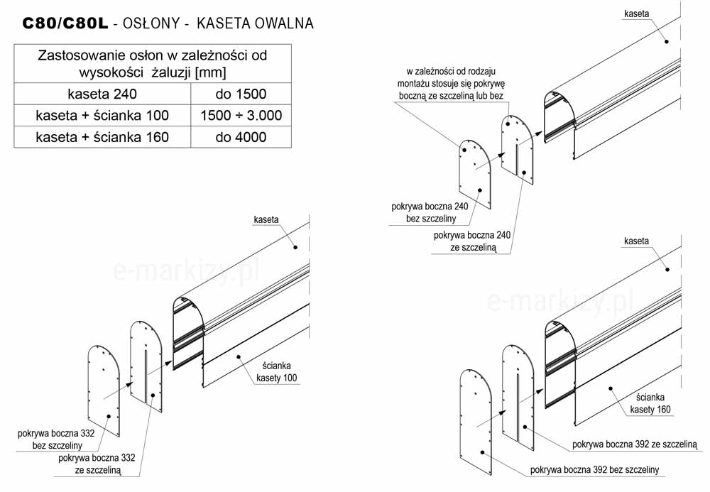 Wysokość kasety osłonowej: 240, 330, 390 mm