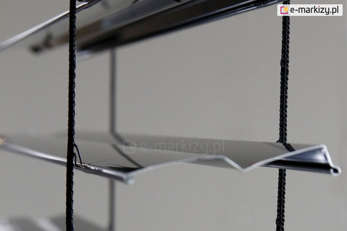 Zawinięte brzegi zapewniają dodatkową wytrzymałość oraz wyciszenie, a płynne sterowanie kątem pochyłu lameli umożliwia swobodną regulację natężenia światła