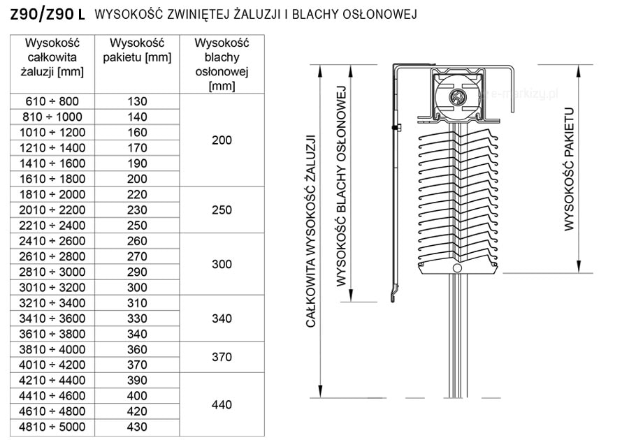 Wysokość blach osłonowych: 200, 250, 300, 340, 390, 440 mm