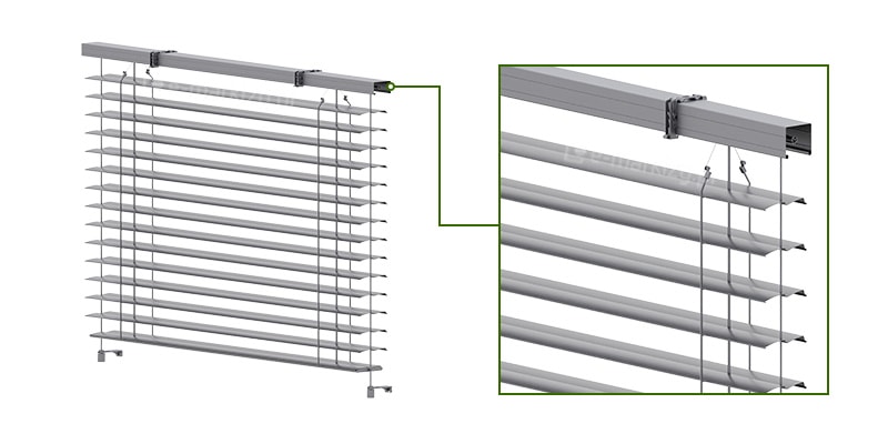 * Uwaga! Żaluzje z prowadnicami linkowymi wykonywane są z lamelami o szerokości mniejszej o 20mm od podanej szerokości całkowitej systemu. Tak, aby zminimalizować możliwość ocierania lameli o ścianki boczne podczas pracy dla montażu wnękowego.