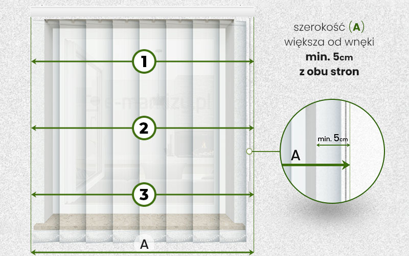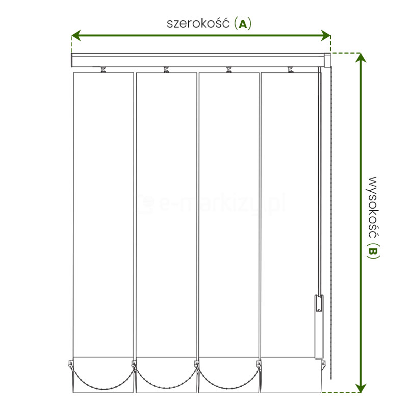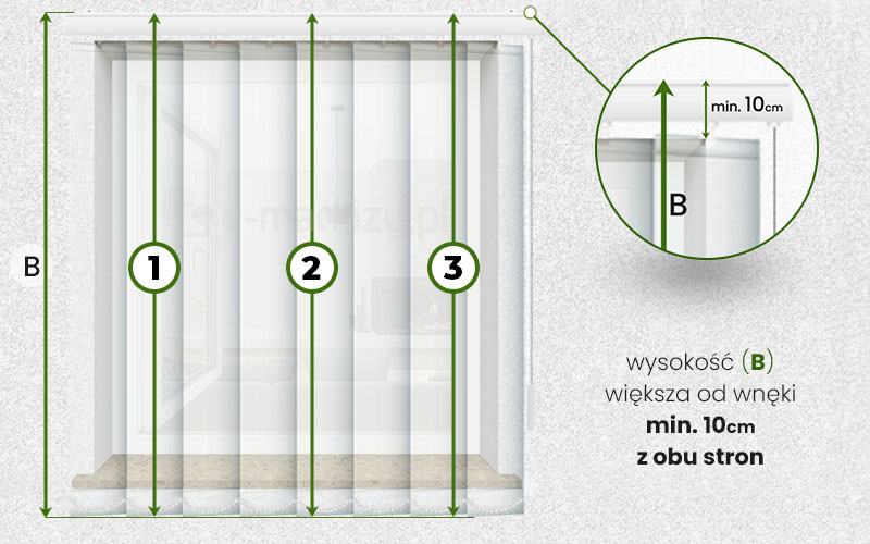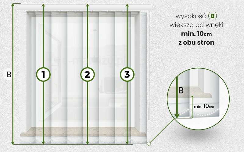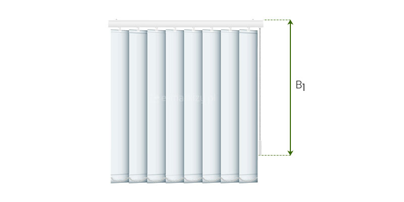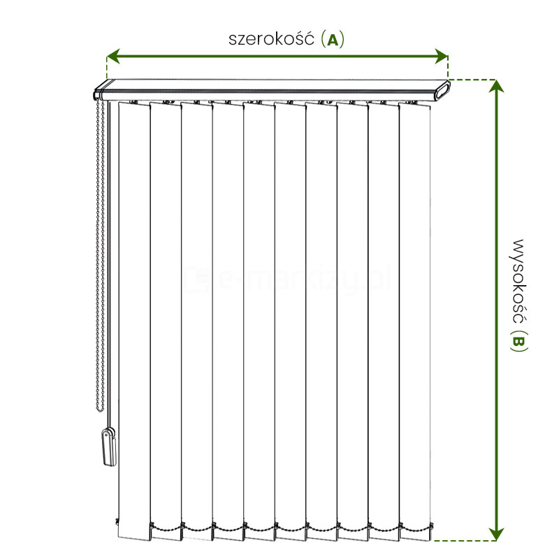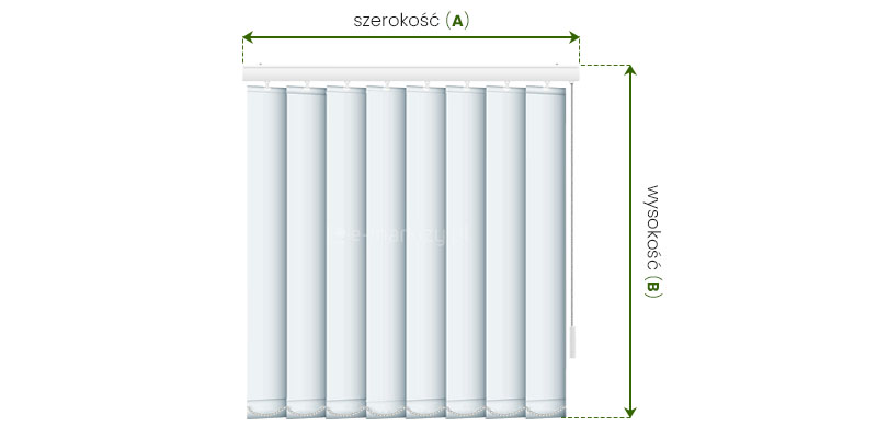 WYSOKOŚĆ B – w zamówieniu podajemy wymiar B, czyli wymiar zewnętrzny wymiar szyny z paskami. Należy jednak pamiętać aby np. zachować pewien luz (np. 2cm) do parapetu, w przypadku montażu we wnece, lub np. przy montażu do ściany, gdzie paski miałyby sięgać do ziemi, również musimy zostawić pewien luz.